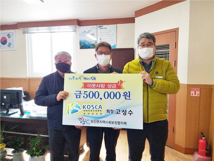 ÀåÈﱺ ȸÁø¸é Áö¿ª»çȸº¸ÀåÇùÀÇü´Â Áö³ 26ÀÏ ´ëÇÑÀü¹®°Ç¼³Çùȸ Àü³²µµÈ¸(ȸÀå °í¼º¼ö)¿¡¼ ¾î·Á¿î ÀÌ¿ôÀ» µ½±â À§ÇÑ ¼º±Ý 50¸¸ ¿øÀ» ±âŹÇß´Ù°í ¹àÇû´Ù.